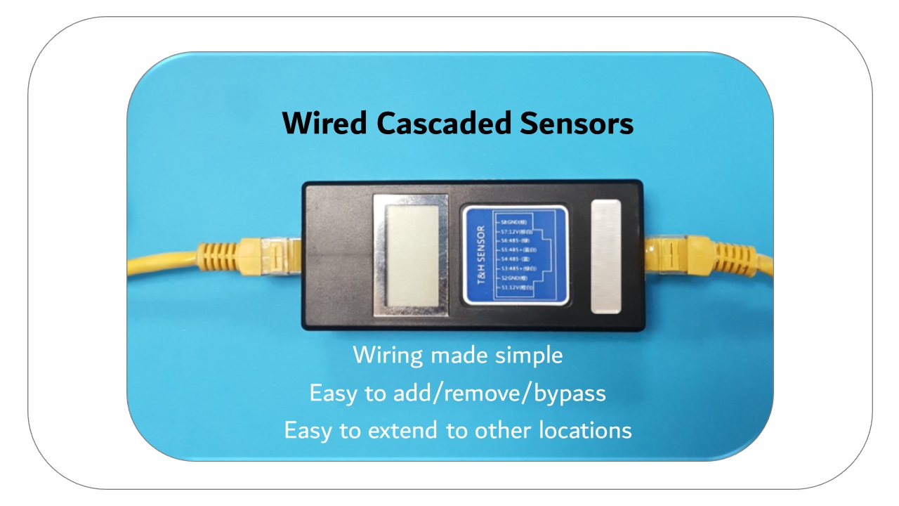 We also provide Wired Sensor Solutions for Monitoring. Smartly, we make wiring easy thru cascading the sensors using CAT6 cables and RJ45 connectors. This makes adding/removing/bypassing sensor modules easy and flexible.