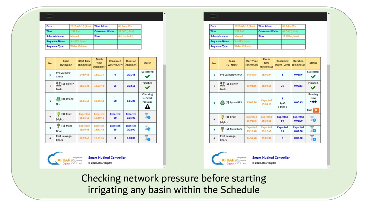 The variation in the length of irrigation pipes, the number of openings in the pipe, the pump pressure, besides the height of the basins are all factors impacting water flow. In such cases, setting a Time-Period schedule for basins gives no idea if the basins are over-irrigated or under-irrigated. Irrigation by volume ensures the right amount of water always.