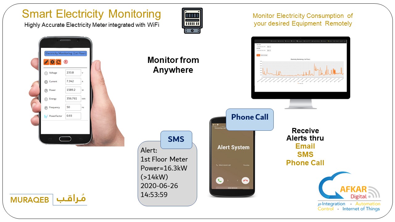 MURAQEB-Electricity Pro and MURAQEB-Electricity Advanced are both IoT products for measuring Electrical Attributes and Energy Consumption (k.Wh) and monitor them remotely over the internet. Both MURAQEB Pro and MURAQEB Advanced are customized from our Enterprise Solutions and aimed for small business and home use.
