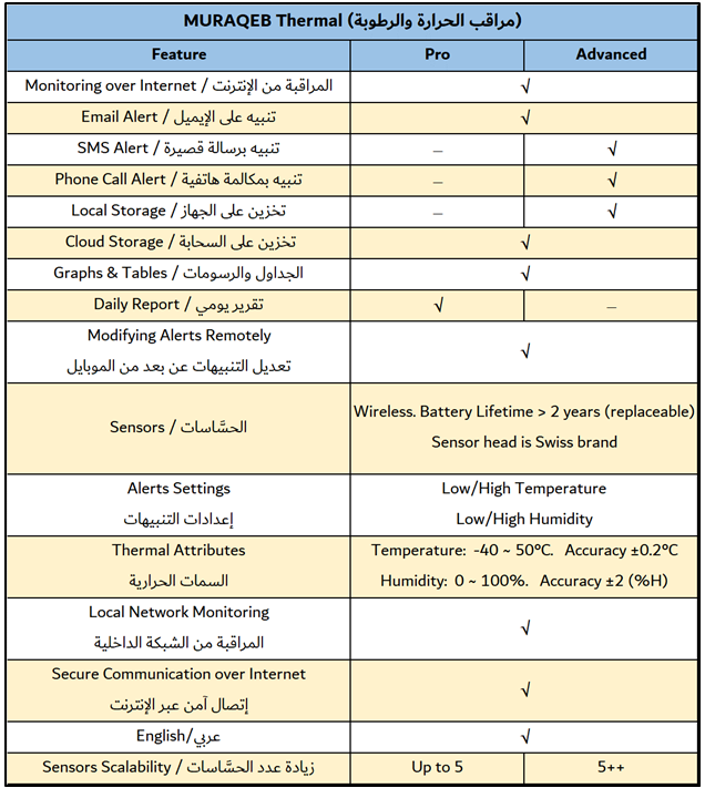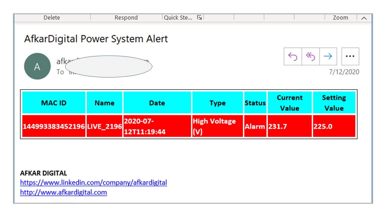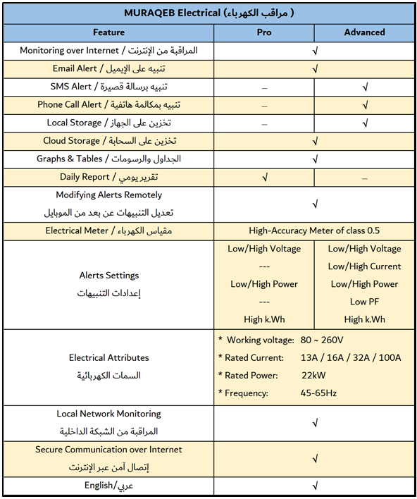 Depending on MURAQEB type Pro/Advanced, Alerts can be set for high/low Voltage, high/low Current, high/low Power, low PF, and high Energy Usage (kW.h).