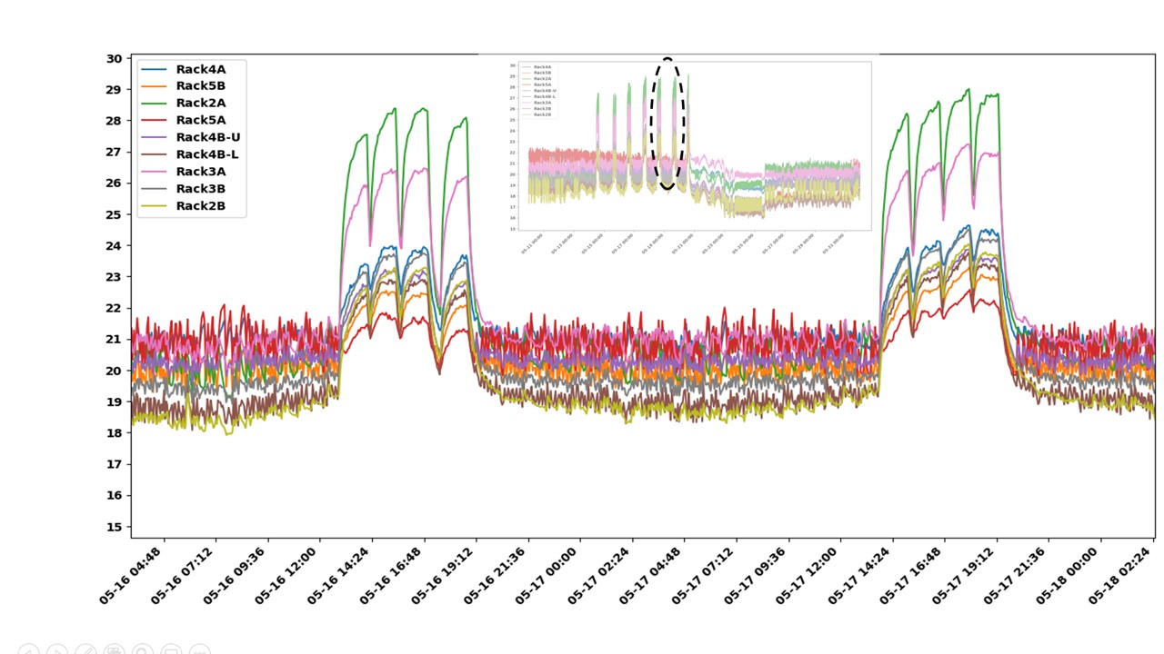 نمط درجة الحرارة هذا ظهر خلال الصيف الحار وكشف عن إنخفاض كفاءة التبريد لوحدات تكييف الهواء في غرفة مركز بيانات أحد العملاء.