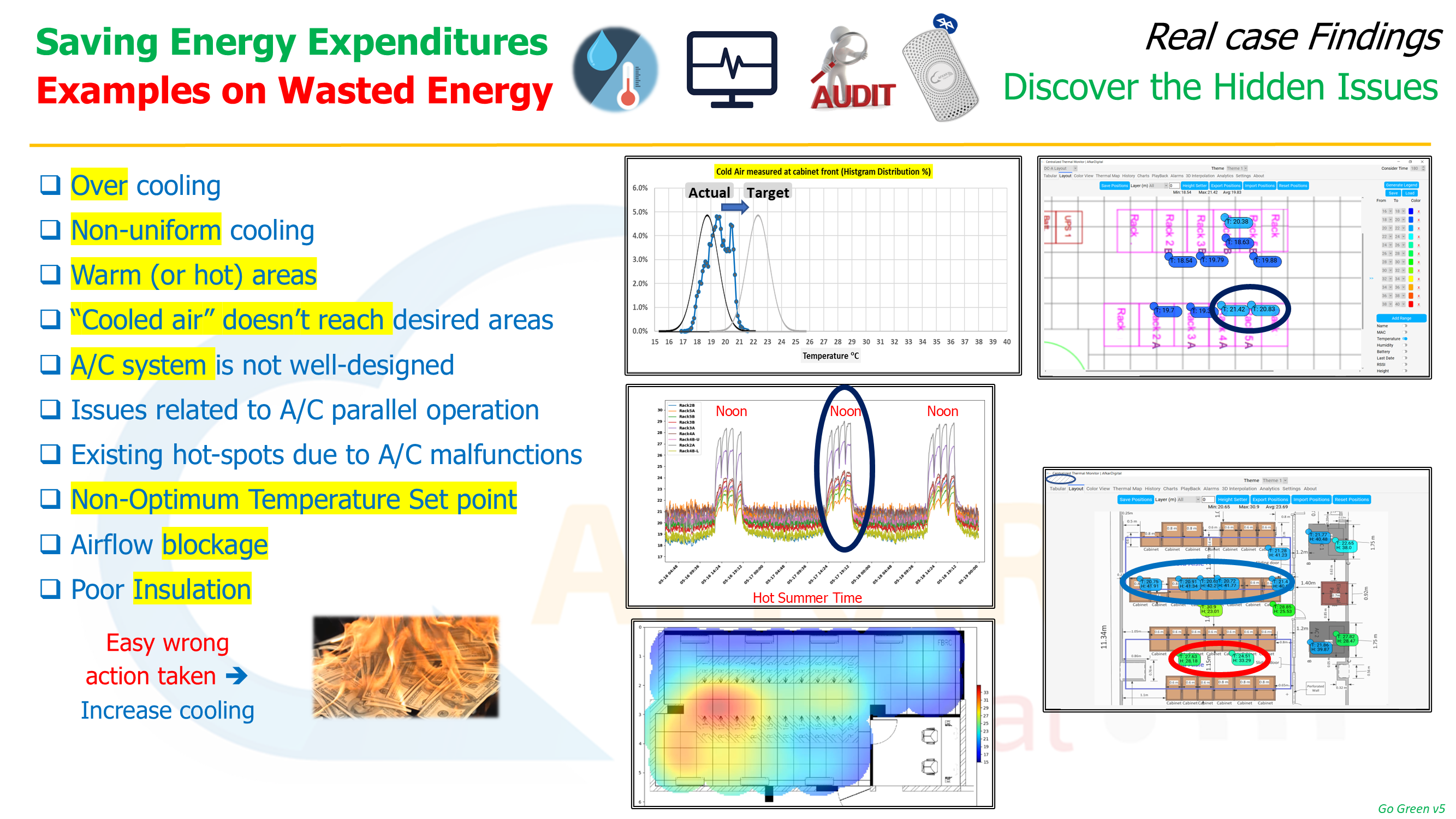 The temperature, which clearly increased, was measured at the front of the cabinets to show the actual temperature flowing into the servers. This is indeed better than having few probes hanged from the ceiling (as seen sometimes!) measuring average temperature in the room.