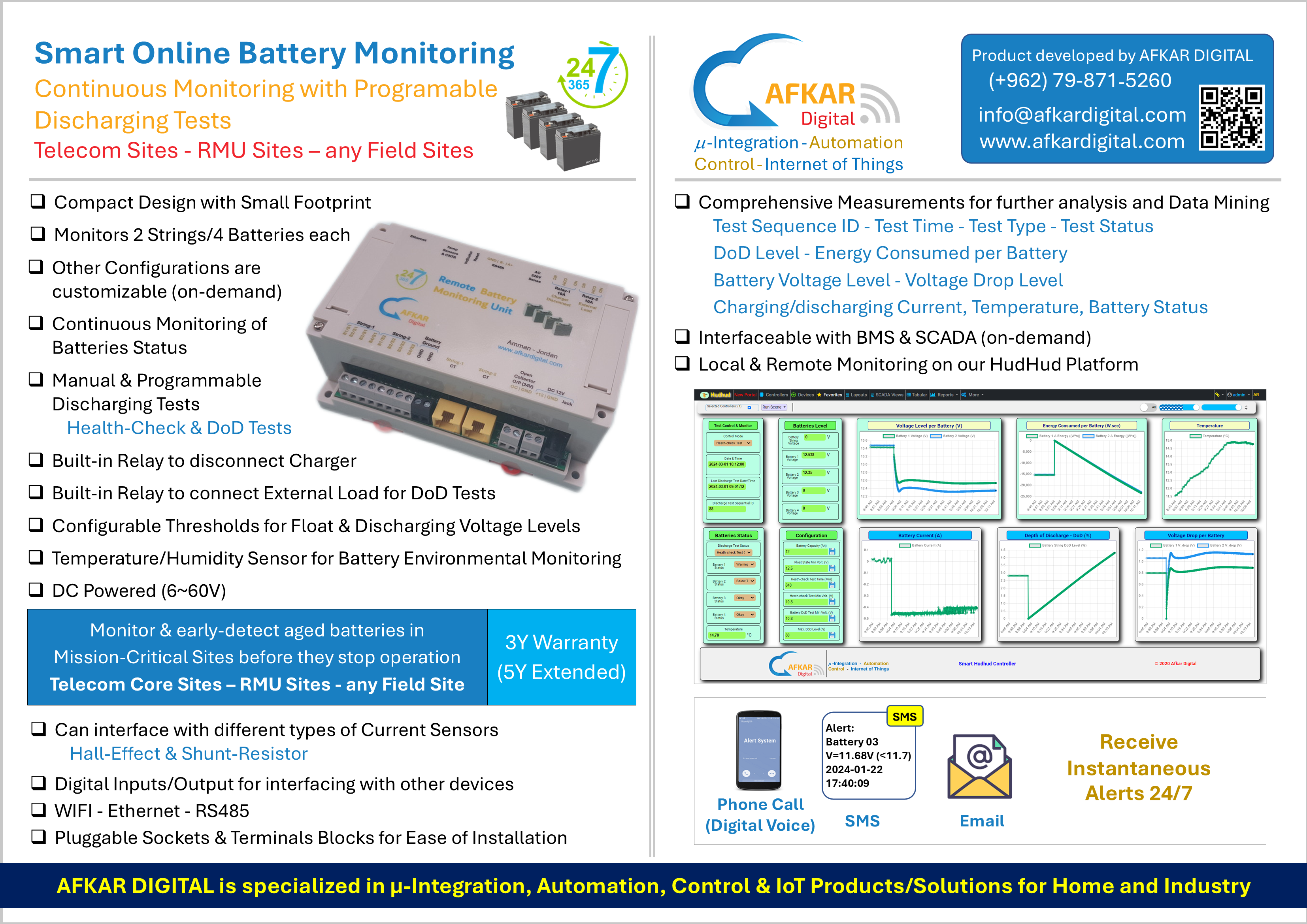 Smart and Online Monitoring Programable Discharging Tests Eearly detection of aged batteries in Mission-Critical Sites Comprehensive Measurements for further analysis and Data Mining