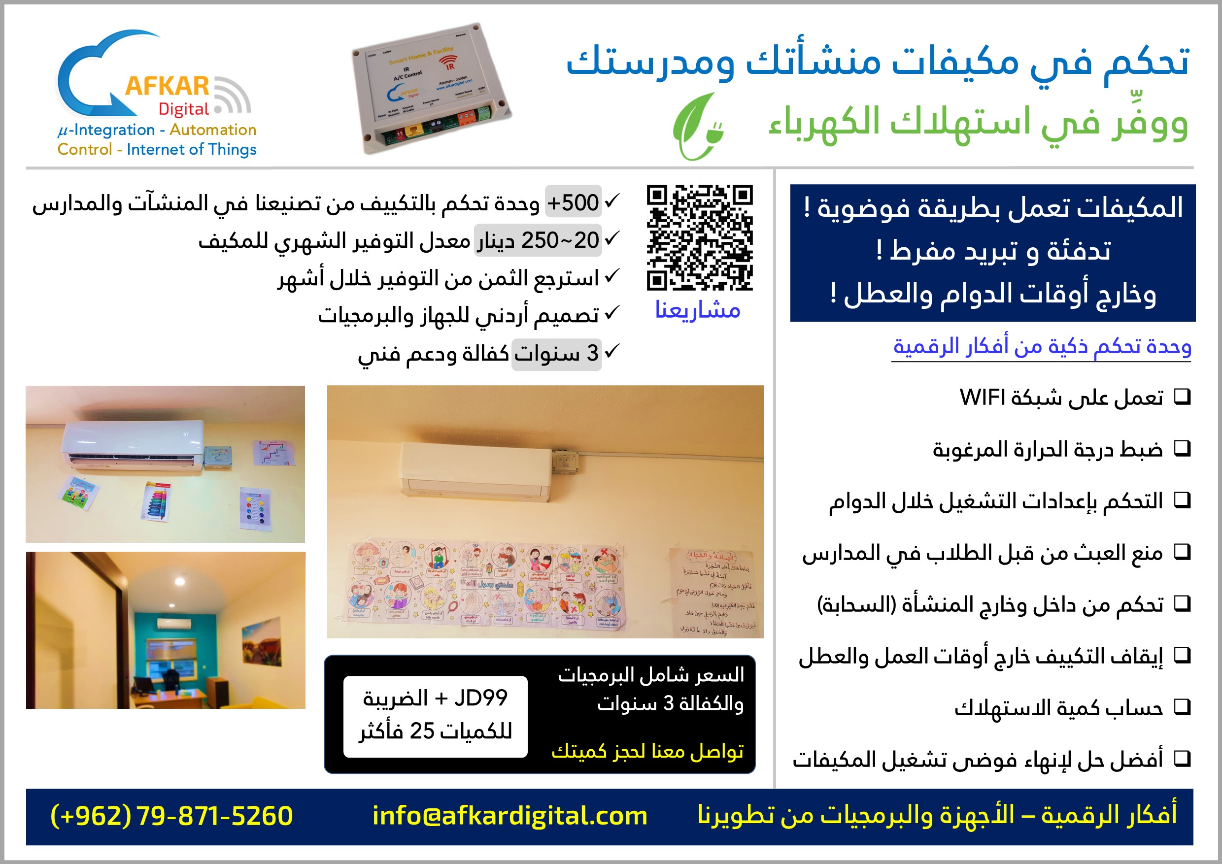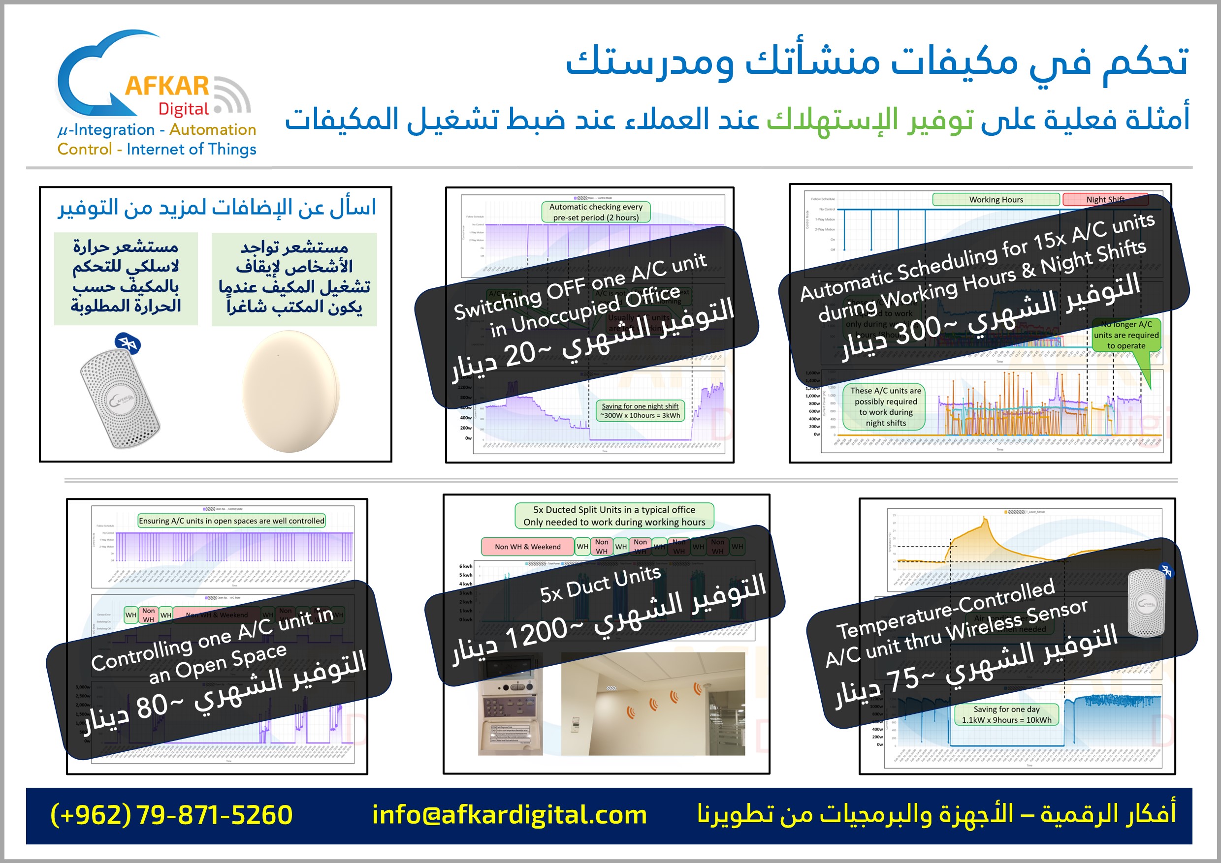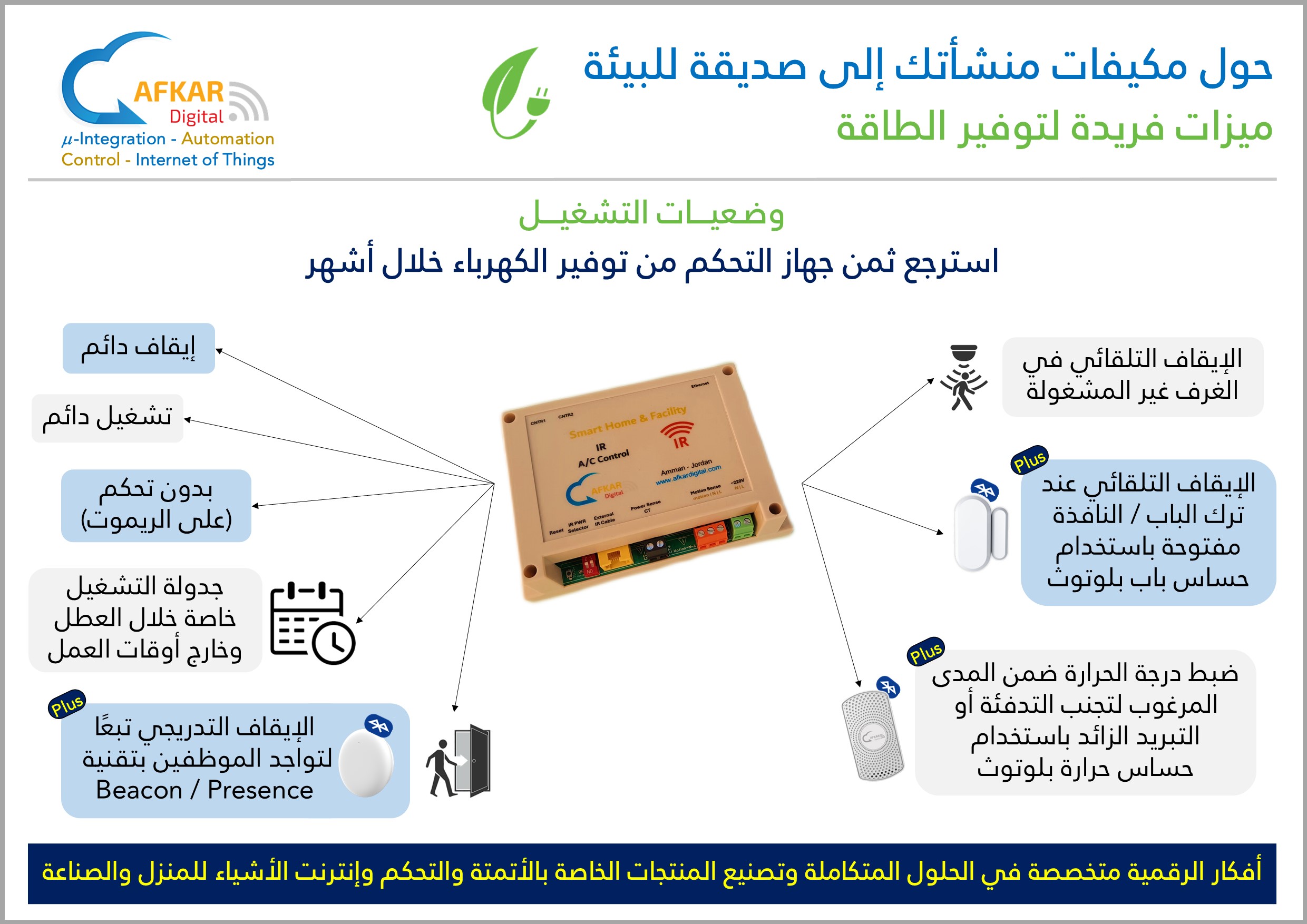 Save Waste in Electricity Consumption (توفير الهدر في استهلاك الكهرباء) Controlling operation settings during working hours (التحكم بإعدادات التشغيل خلال الدوام) Preventing students from tampering with school A/C (منع عبث الطلاب في مكيفات المدارس) Turning off A/C during off-duty hours & holidays (إيقاف التكييف خارج أوقات العمل والعطل) The optimum solution to end A/C operation chaos (الحل الأمثل لإنهاء فوضى تشغيل المكيفات)